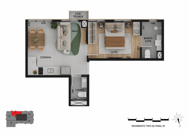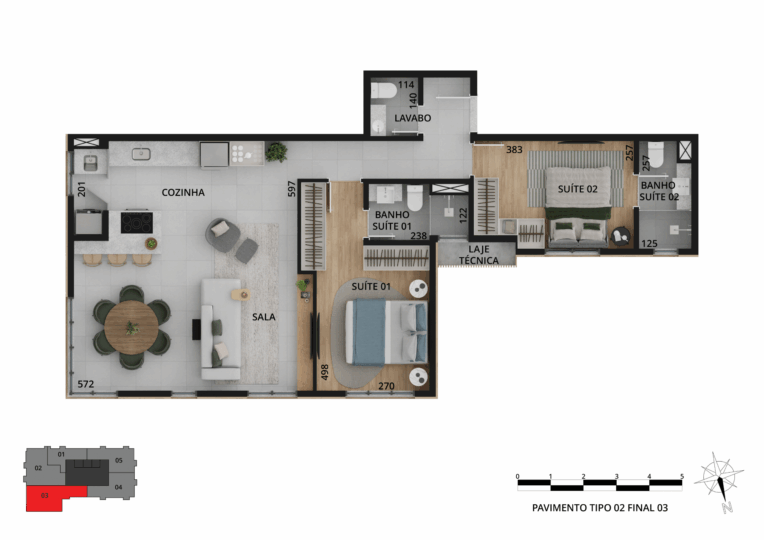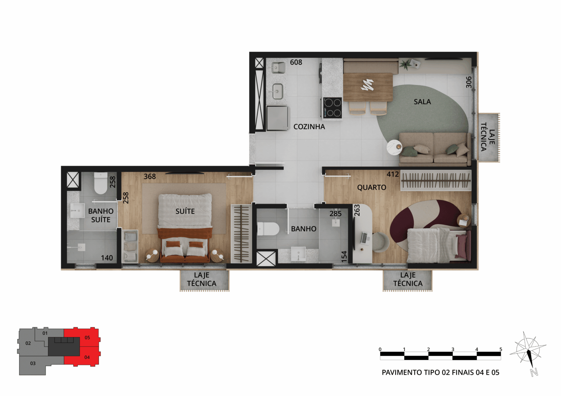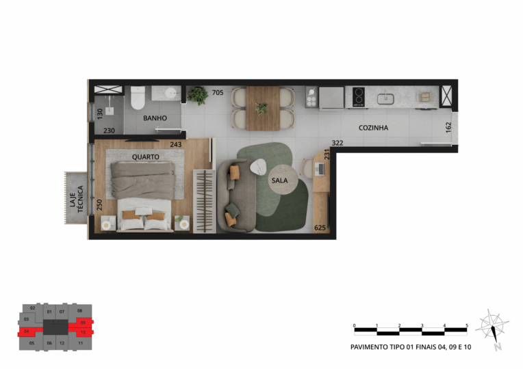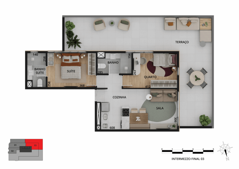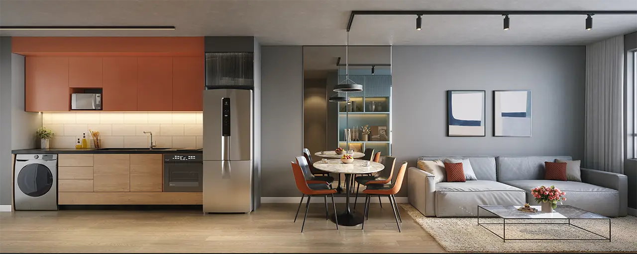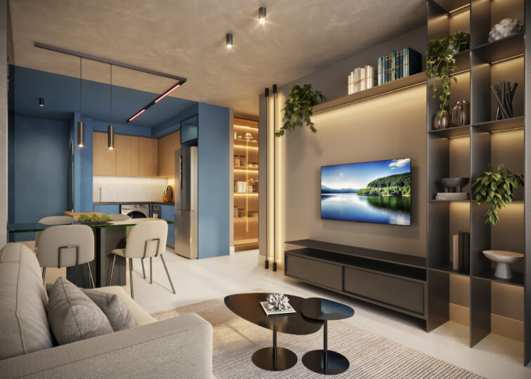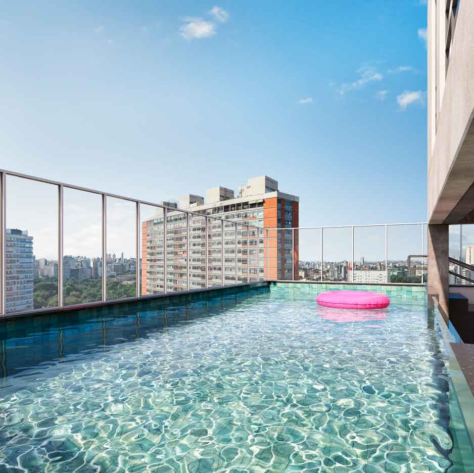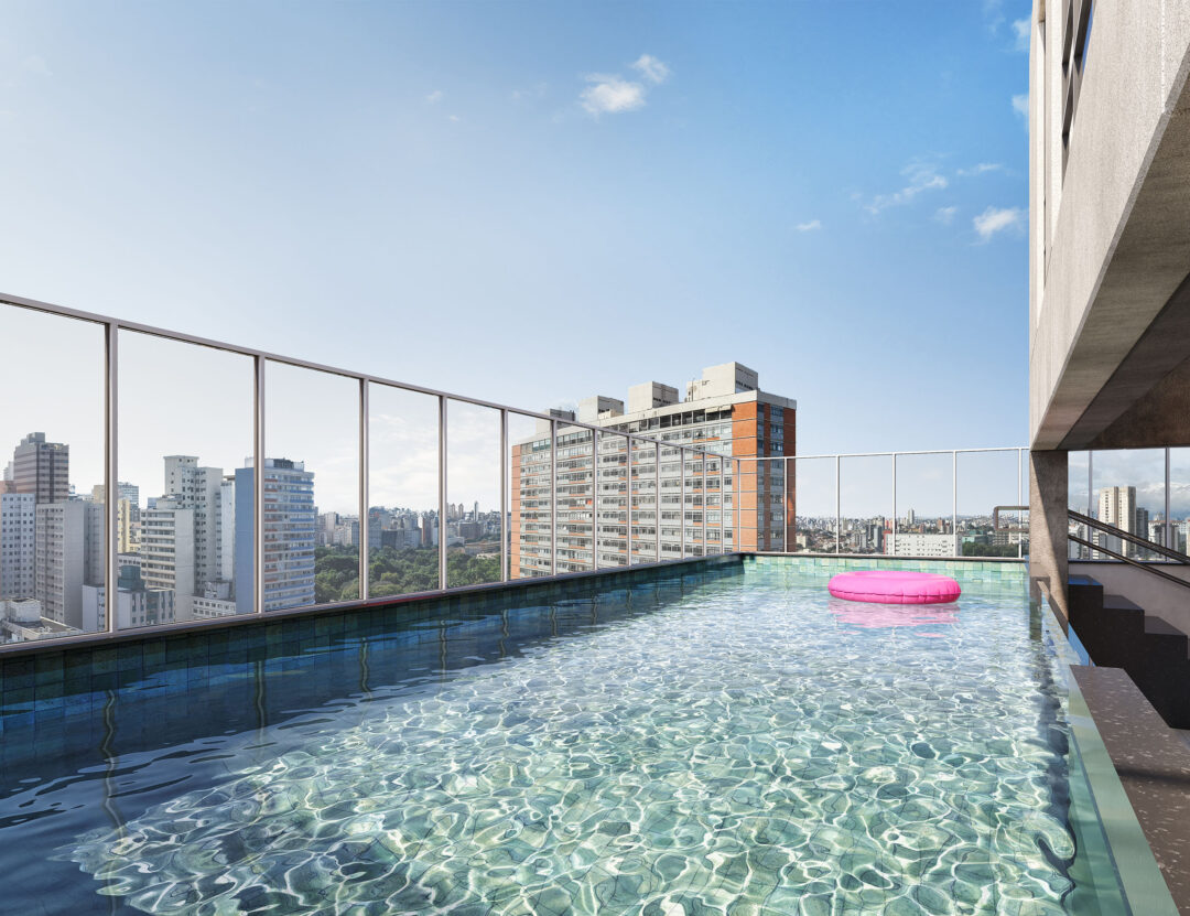 Os espaços privados trazem sofisticação e tecnologias, além de plantas variadas, com studios e apartamentos de 1 a 3 quartos, metragem de 33 m² a 109 m² e vaga de garagem exclusiva.