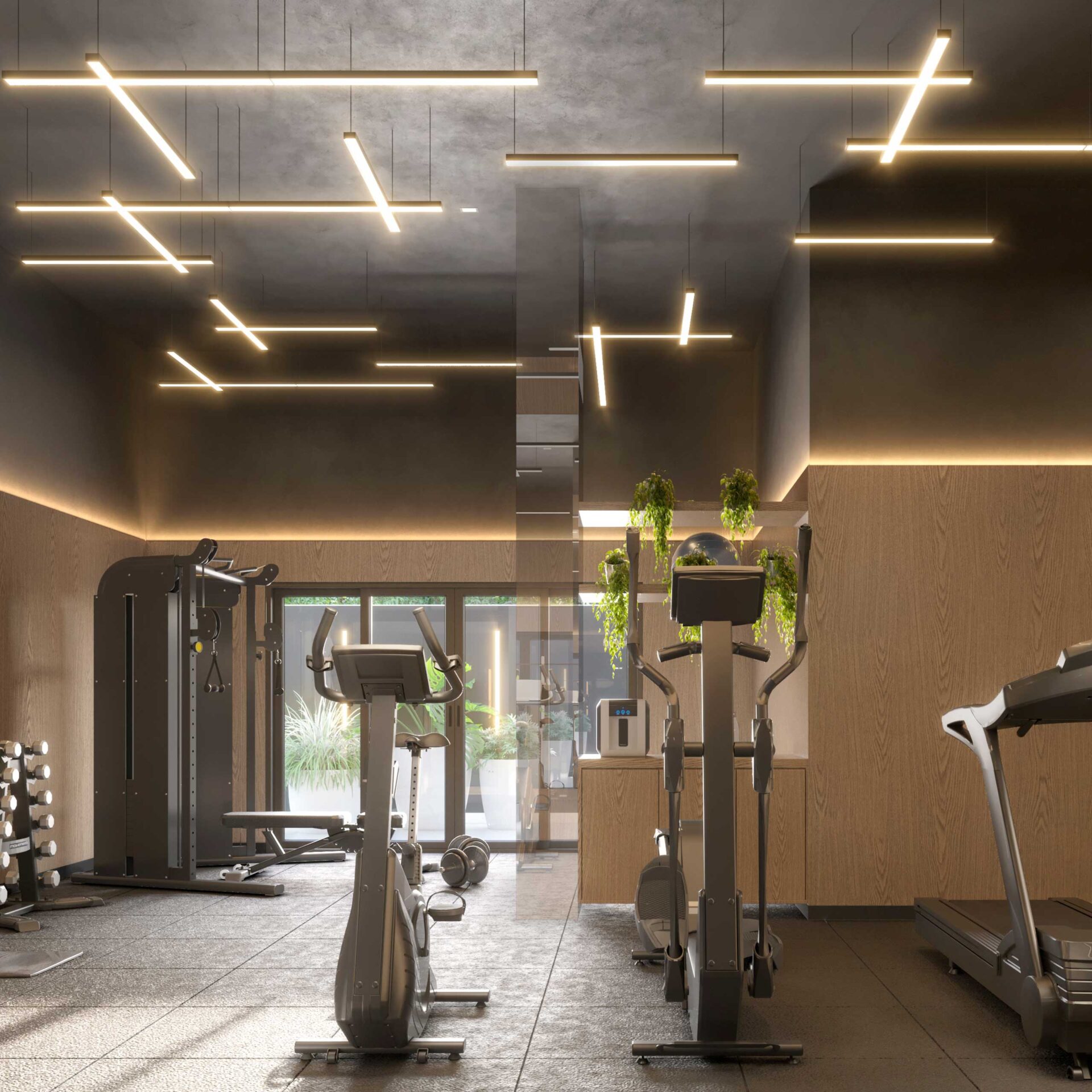 Salão de festas com pé-direito duplo e forro acústico